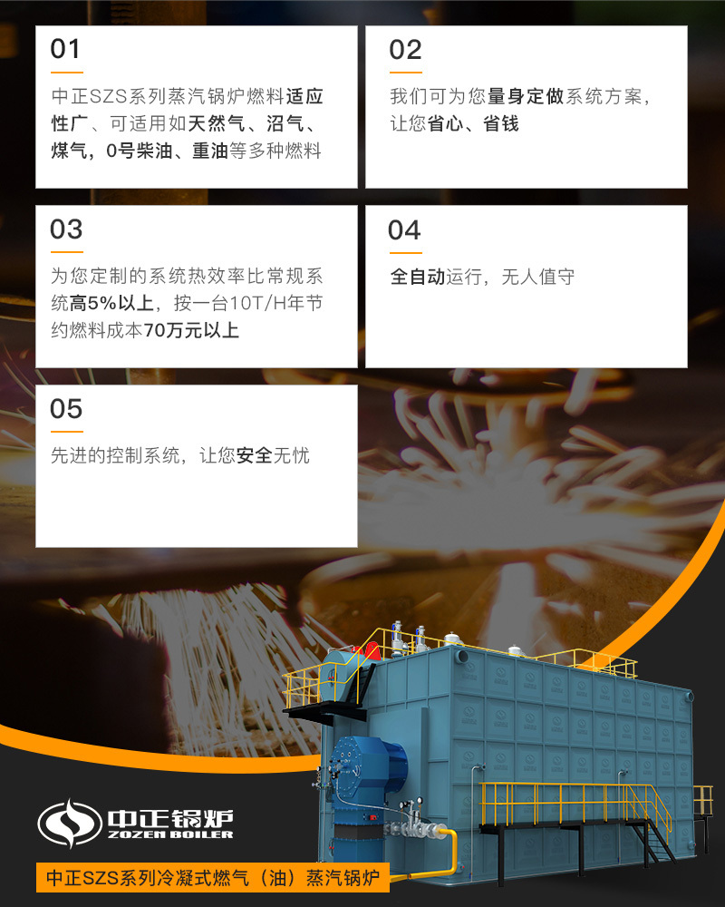 常用噸位:4噸SZS冷凝燃氣蒸汽鍋爐、10噸SZS燃氣蒸汽鍋爐、20噸szs燃氣蒸汽鍋爐、25噸SZS燃氣鍋爐、30噸szs型噸燃氣鍋爐、45噸szs鍋爐